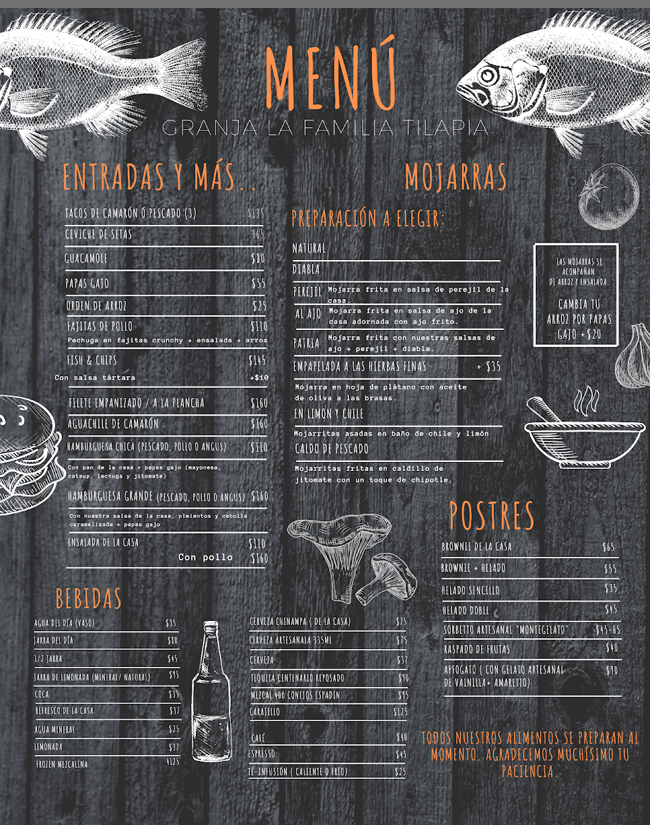 The menu at Granja La Familia Tilapia offers a delightful range of dishes that showcase the flavors of fresh seafood and traditional Mexican cuisine. Among the standout options is the Mojarras, a popular dish that perfectly highlights the freshness of the fish. If you're a fan of garlic, the Mojarra Al Mojo de Ajo is a must-try, as it combines the delicate taste of fish with a rich, garlicky sauce. For those who prefer something with a zesty kick, the Tilapia Con Limón Y Chile offers a tangy and spicy experience with the refreshing touch of lime and chili.